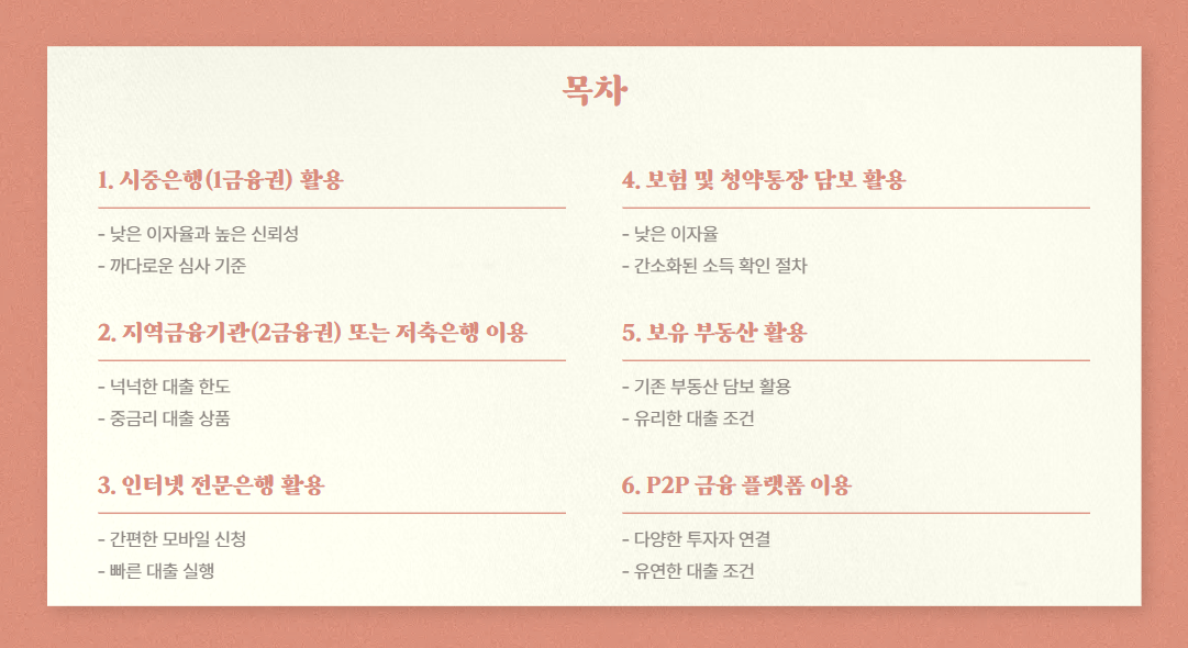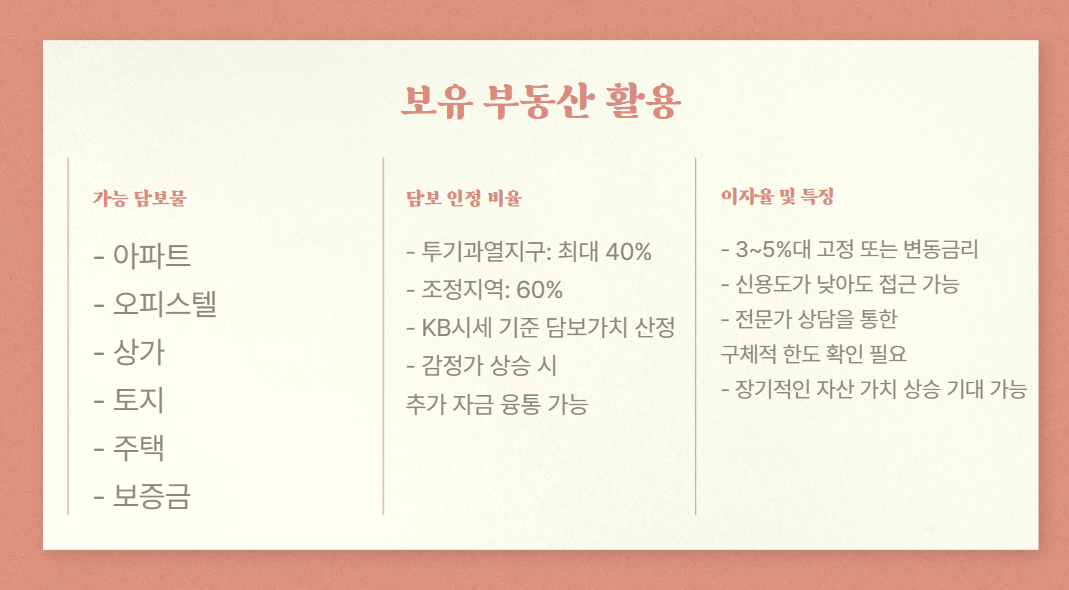- 가능 담보물: 아파트, 상가, 토지, 주택 등