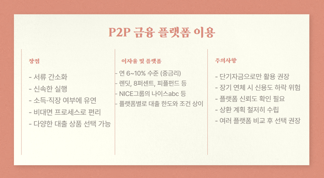 - 플랫폼 예시: 렌딧, 8퍼센트, 피플펀드 등이 있습니다.