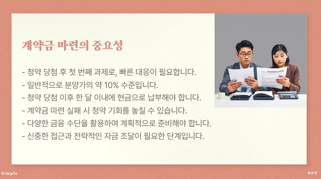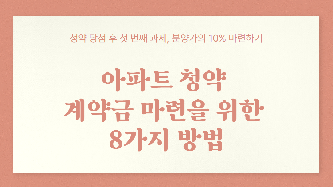 아파트 청약 준비하고 계시나요? 준비하면서도 마음속에서 걱정되는 부분은 아마, 당장 계약금 마련일텐데요. 일단 청약에 당첨된 후 가장 먼저 마주하는 현실적인 과제가 계약금 납부이기 때문입니다. 저 역시 운좋게 청약이 당첨이 되었지만, 처음 내야하는 비용을 마련을 하지 못해 실패했던 적이 있었는데요, 이 글에서는 계약금 마련이 막막할 때 활용할 수 있는 8가지 구체적인 방법을 소개해드릴께요!