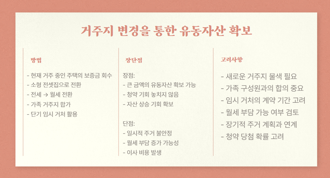 마지막으로, 당장 확보 가능한 현금을 만드는 방법 중 하나는 현재 거주 중인 주택의 보증금 회수 또는 소형 전셋집 전환입니다. 많은 분들이 계약금이 없어 청약을 포기하지만, 실상은 자신의 자산 중 가장 많은 금액이 ‘거주지’에 묶여 있는 경우가 많습니다.