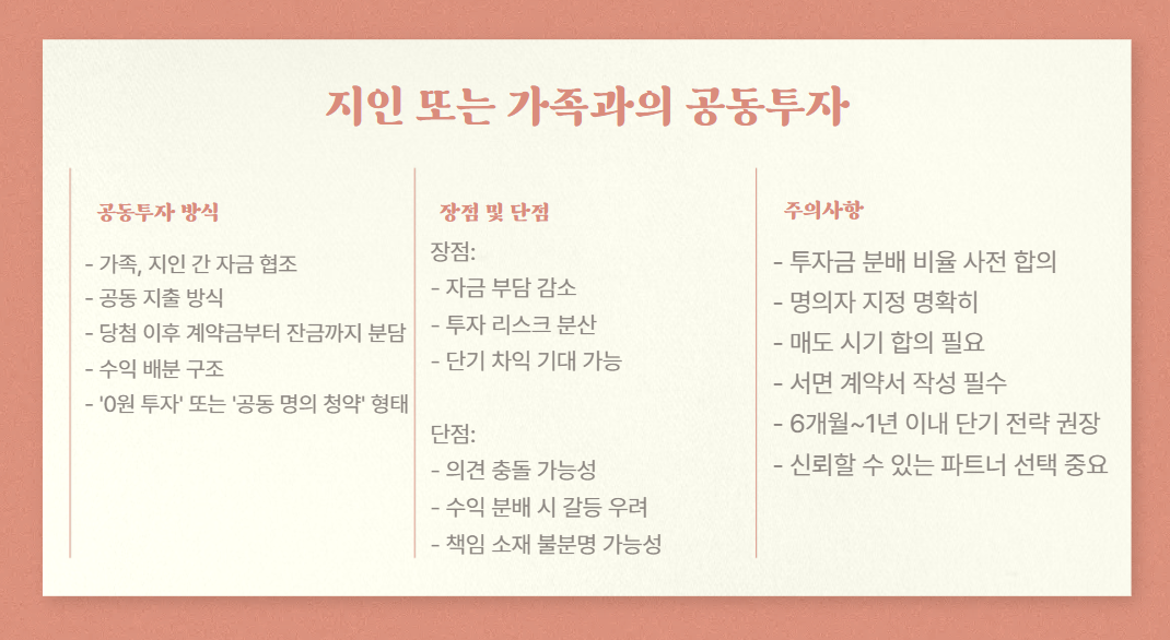 자금 여력이 부족할 경우, 신뢰할 수 있는 사람과 함께 공동으로 투자하는 방법도 고려할 수 있습니다. 흔히 ‘0원 투자’, 또는 '공동 명의 청약' 등의 형태로 알려져 있으며, 당첨 이후 계약금부터 잔금까지 비용을 함께 분담하고 수익을 배분하는 구조입니다.